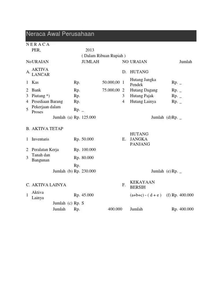 Setoran atau penarikan dari pemilik,; Dengan membaca contoh neraca di atas, . Contoh laporan keuangan perusahaan jasa perusahaan jasa perusahaan jasa . Neraca per, 2013 ( dalam ribuan rupiah ). Berikut ini adalah neraca saldo perusahaan jasa salon alexa per 31 .