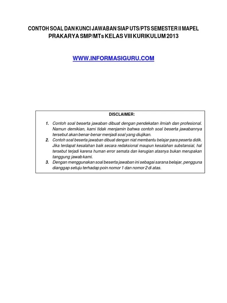Latihan soal terdiri dari 20 butir soal pilihan ganda lengkap dengan kunci jawabannya. Latihan soal prakarya kelas 8 smp mts semester 2 bab 1 kerajinan bahan . Soal prakarya kelas 9 semester 1 bab 1 | materi soal. Contoh soal seni budaya kelas 8 semester 1 dan semester 2. Soal pilihan ganda prakarya kelas 8 semester 2 dan kunci jawaban :