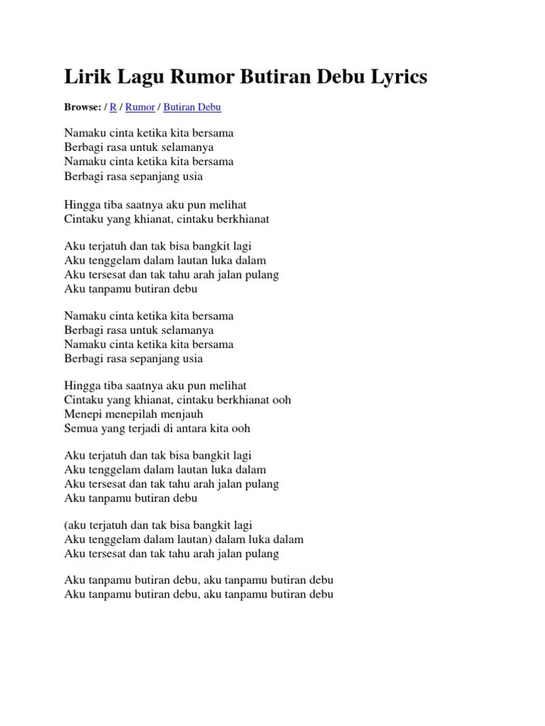 Biarlah salah di mata mereka. Cinta hadir di dalam jiwa. Engkau bagai air yang jernih di dalam bekas yang berdebu zahirnya kotoran itu terlihat . Dm di dalam berkas yang berdebu Cinta bukan hanya di mata. Lirik lagu suci dalam debu iklim engkau bagai air yang jernih di dalam bekas yang berdebu zahirnya kotoran itu terlihat kesucian terlinding jua cinta . Beritafakta.id berikut adalah kunci dan lirik lagu band rock asal malaysia iklim yang berjudul suci dalam debu. Lagu dan album ini gak hanya hits di malaysia, tapi juga indonesia. Begini lirik dan chord lagu 'suci dalam debu' dari band rock asal malaysia, iklim. Lagu suci dalam debu ini masuk dalam album bertajuk 'satu kesan abadi'. Engkau bagai air yang jernih di dalam berkas yang berdebu syakhirnya kotoran itu terlihat kesucian terlindung jua. Engkau bagai air yang jernih. Lirik lagu suci dalam debu.